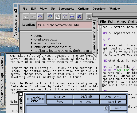 Note that wm2, even in this third release, does not support multi-headed displays. Also, ironically, wm2 does not support programs that run in shaped windows.